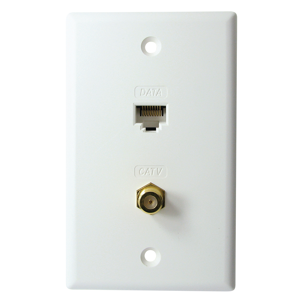 1x CATV F-TYPE + 1x CAT5 JACK – WALL PLATE – SINGLE GANG – WHITE – 10 EA/PER PACK